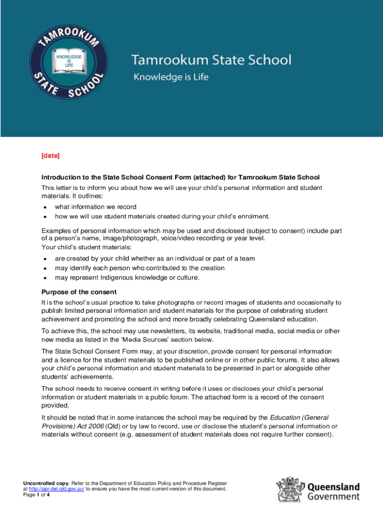 [date] Introduction to the State School Consent Form (attached) for Taproom State School This letter is to inform you about how we will use your children personal information and student materials.