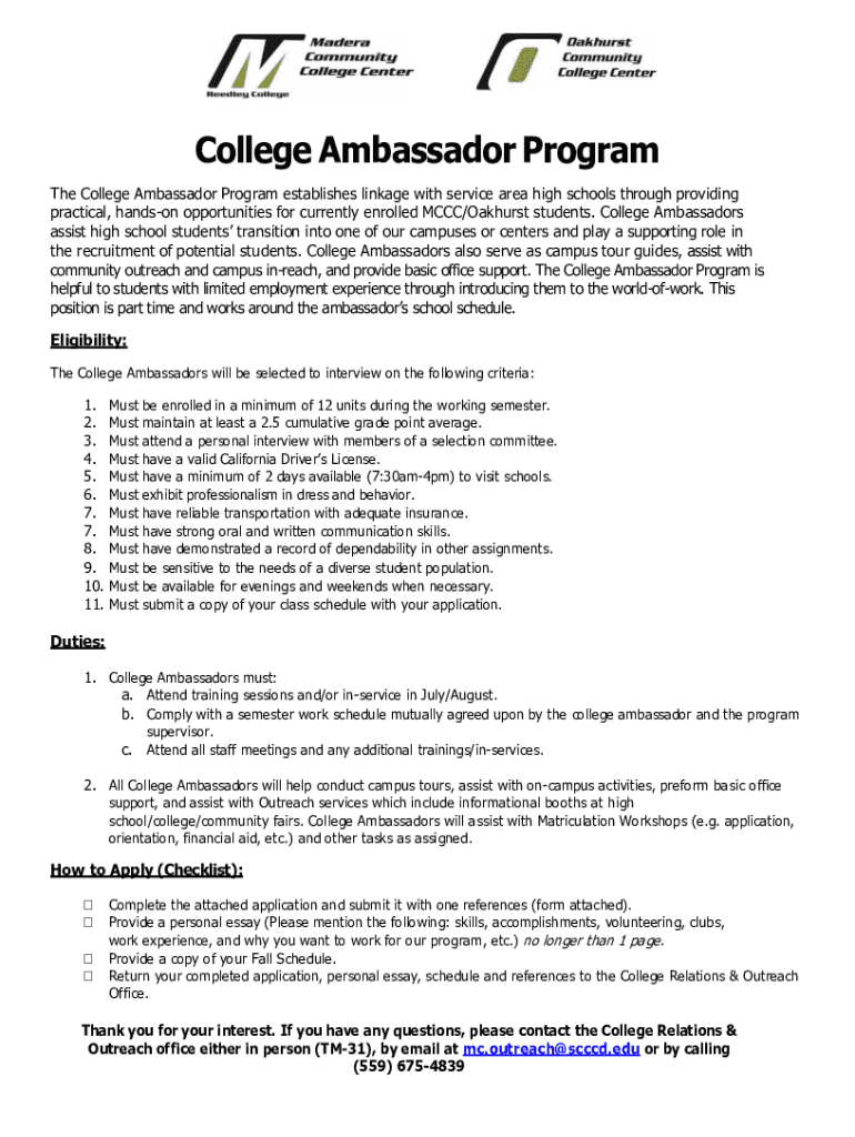 College Ambassador Program The College Ambassador Program establishes linkage with service area high schools through providing practical, Hanson opportunities for currently enrolled CCC/Pankhurst