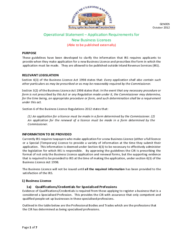 GEN005 October 2012Operational Statement Application Requirements for New Business Licenses (Able to be published externally) PURPOSE These guidelines have been developed to clarify the information
