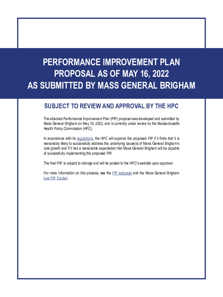 PERFORMANCE IMPROVEMENT PLAN PROPOSAL AS OF MAY 16, 2022, AS SUBMITTED BY MASS GENERAL BRIGHAM SUBJECT TO REVIEW AND APPROVAL BY THE HPC The attached Performance Improvement Plan (PIP) proposal was