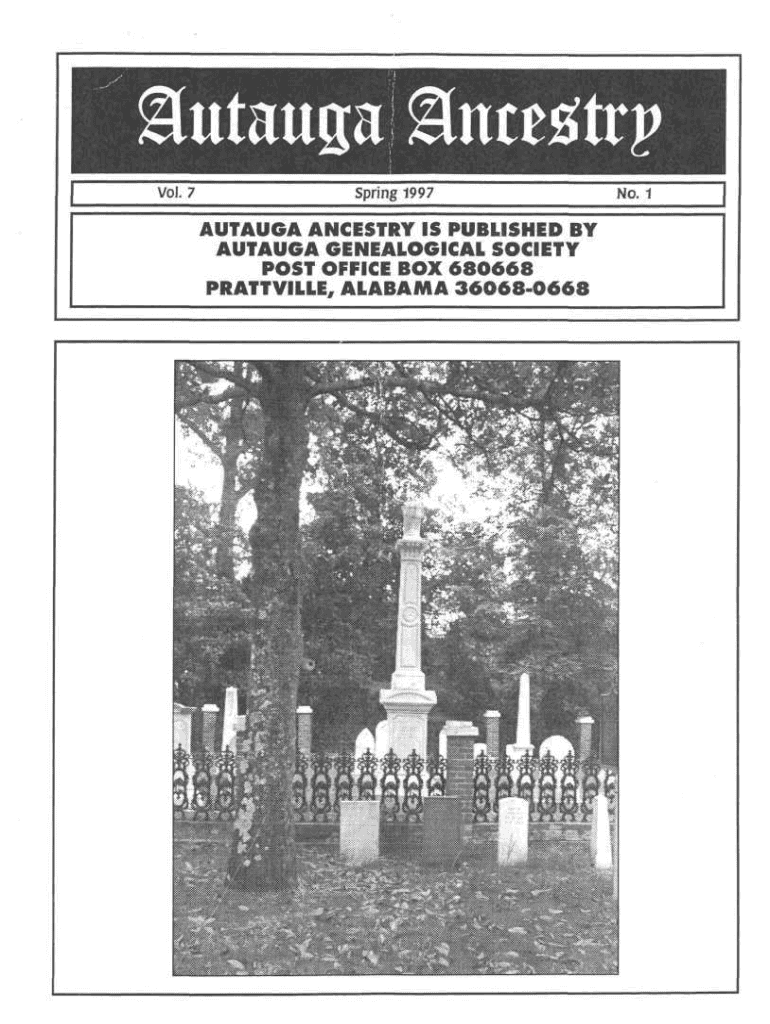 Autumn! &ntt&txv Vol.7Spring 1997AUTAUGA ANCESTRY IS PUBLISHED BY AUTUMN GENEALOGICAL SOCIETY POST OFFICE BOX 6 8 0 6 6 8 PRATTVILLE, ALABAMA 3 6 0 6 8 0 6 6 8No. 1AUTAUGA GENEALOGICAL SOCIETY, INC.