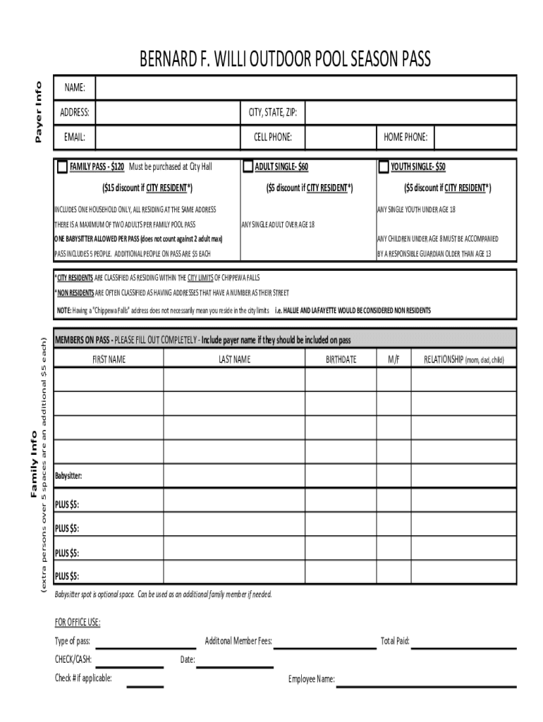 Payer InfoBERNARD F. WILL OUTDOOR POOL SEASON PASS NAME: ADDRESS:CITY, STATE, ZIP:EMAIL:CELL PHONE:HOME PHONE:ADULT SINGLE $60FAMILY PASS $120 Must be purchased at City Hall ($15 discount if CITY
