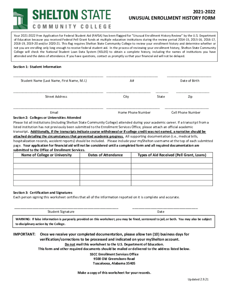 20212022 UNUSUAL ENROLLMENT HISTORY FORM Your 20212022 Free Application for Federal Student Aid (FAFSA) has been flagged for Unusual Enrollment History Review by the U.S. Department of Education because