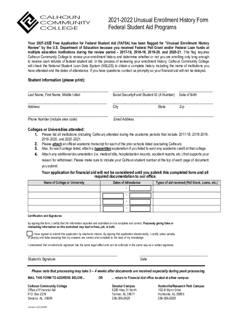 20212022 Unusual Enrollment History Form Federal Student Aid Programs Your 20212022 Free Application for Federal Student Aid (FAFSA) has been flagged for Unusual Enrollment History Review by the U.S.