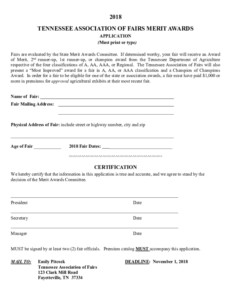 2018 TENNESSEE ASSOCIATION OF FAIRS MERIT AWARDS APPLICATION (Must print or type) Fairs are evaluated by the State Merit Awards Committee. If determined worthy, your fair will receive an Award of