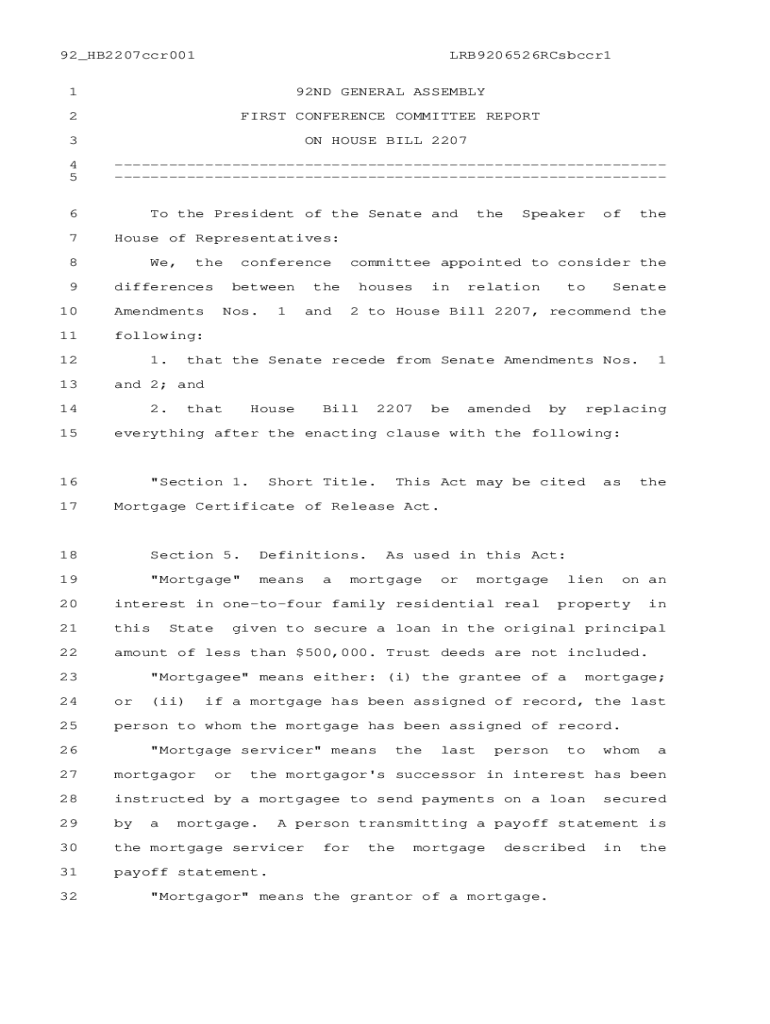 92_HB2207ccr001LRB9206526RCsbccr1192ND GENERAL ASSEMBLY2FIRST CONFERENCE COMMITTEE REPORT3ON HOUSE BILL 22074 56 7To the President of the Senate Andre,9differencesthe10Amendments11following:121.13and