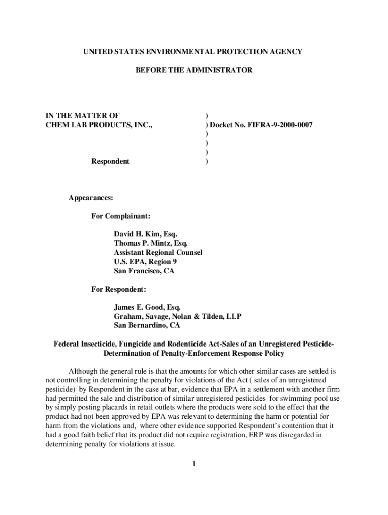 UNITED STATES ENVIRONMENTAL PROTECTION AGENCYBEFORE THE ADMINISTRATOR IN THE MATTER SACHEM LAB PRODUCTS, INC., )) Docket No. FIFRA920000007))))RespondentAppearances: For Complainant: David H. Kim,