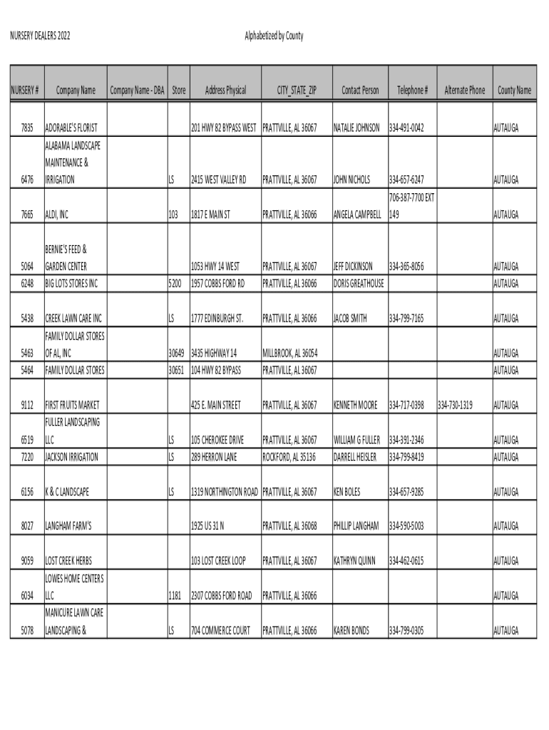NURSERY DEALERS 2022NURSERY # 7835Company NameAlphabetized by CountyCompany Name DBAStoreAddress PhysicalCITY_STATE_Contact PersonTelephone #Alternate PhoneCounty Name201 HWY 82 BYPASS WESTPRATTVILLE,