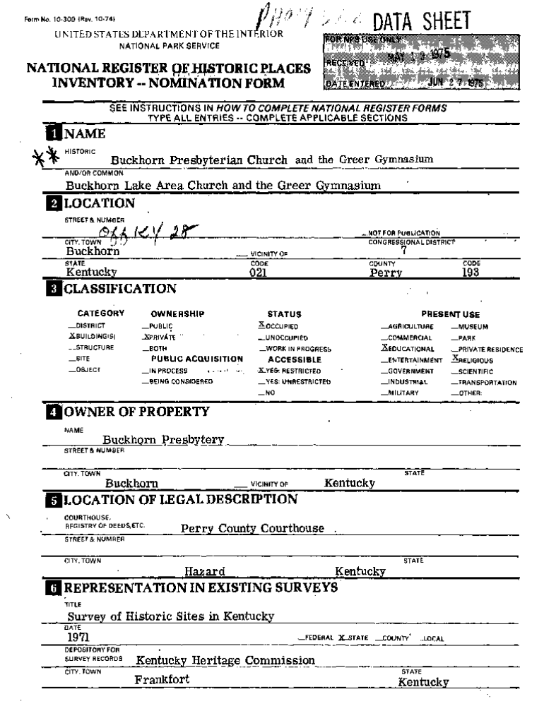 DATA SHEETIVtid ff \'Form No. 10300 (Rev. 1074)UNITED STATES DEPARTMENT OF THE INT PRIOR NATIONAL PARK SERVICENATIONAL REGISTER pf HISTORIC PLACES INVENTORY NOMINATION FORM SEE INSTRUCTIONS IN HOW