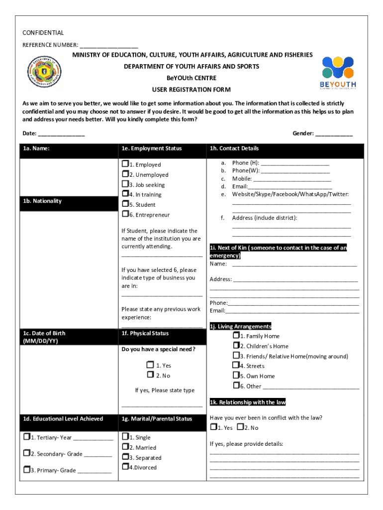 CONFIDENTIAL REFERENCENUMBER:___MINISTRYOFEDUCATION, CULTURE, YOUTHAFFAIRS, AGRICULTUREANDFISHERIES DEPARTMENTOFYOUTHAFFAIRSANDSPORTS BeYOUthCENTRE USERREGISTRATIONFORM Asweaimtoserveyoubetter, wewouldliketogetsomeinformationaboutyou.