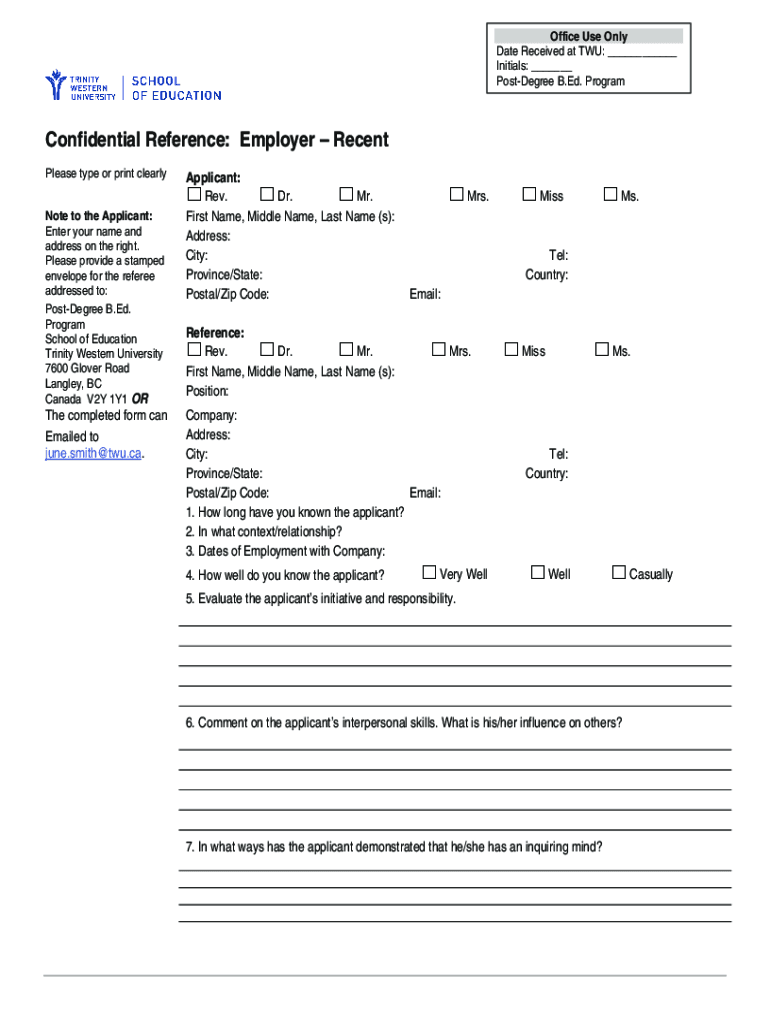 Office Use Only Date Received at TWU: ___ Initials: ___ Postgres B. Ed. ProgramConfidential Reference: Employer Recent Please type or print clearly Note to the Applicant: Enter your name and address