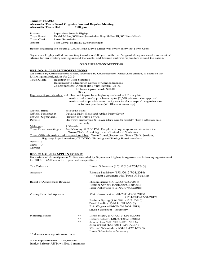 January 14, 2013, Alexander Town Board Organization and Regular Meeting Alexander Town Hall 6:00 p.m. Present: Town Board: Town Clerk: Absent:Supervisor Joseph Higher David Miller, William Schmieder,