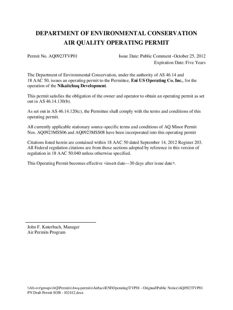 DEPARTMENT OF ENVIRONMENTAL CONSERVATION AIR QUALITY OPERATING PERMIT No. AQ0923TVP01Issue Date: Public Comment October 25, 2012, Expiration Date: Five Years Department of Environmental Conservation,