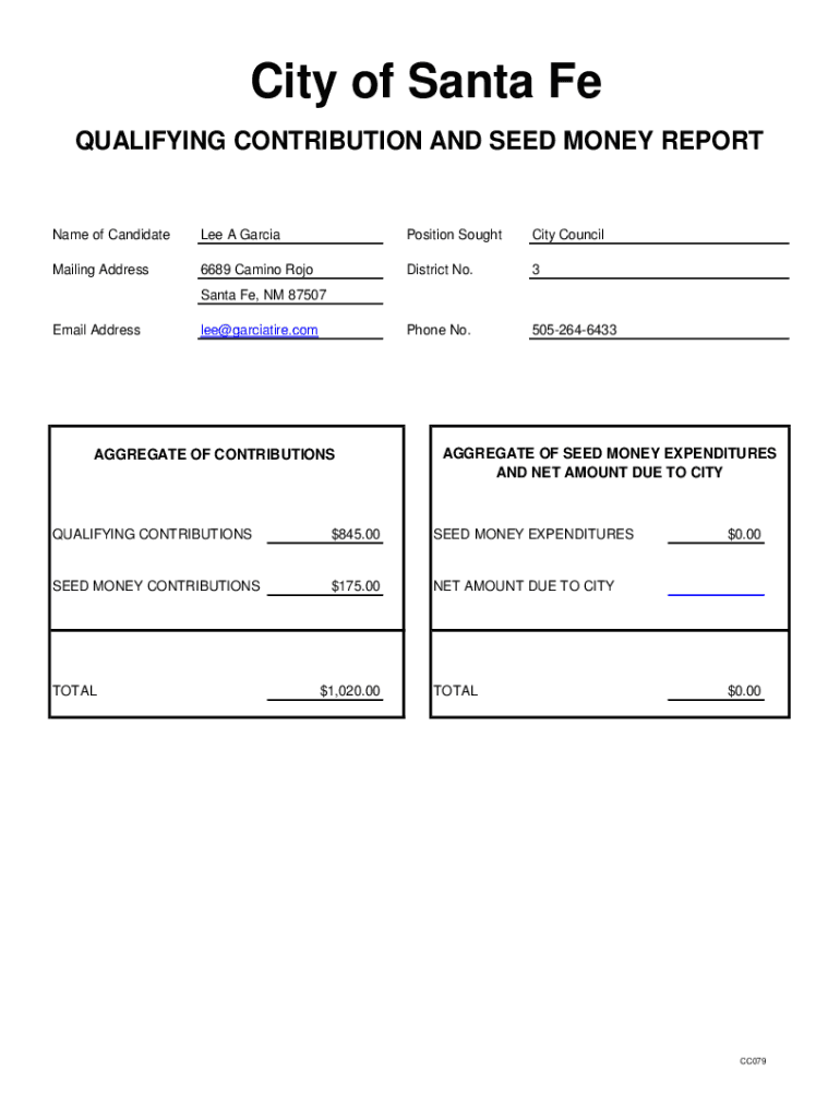 City of Santa Fe QUALIFYING CONTRIBUTION AND SEED MONEY Reportage of Candidate Lee A GarciaPosition SoughtCity CouncilMailing Address6689 Camino Redistrict No.3Phone No.5052646433Santa Fe, NM 87507