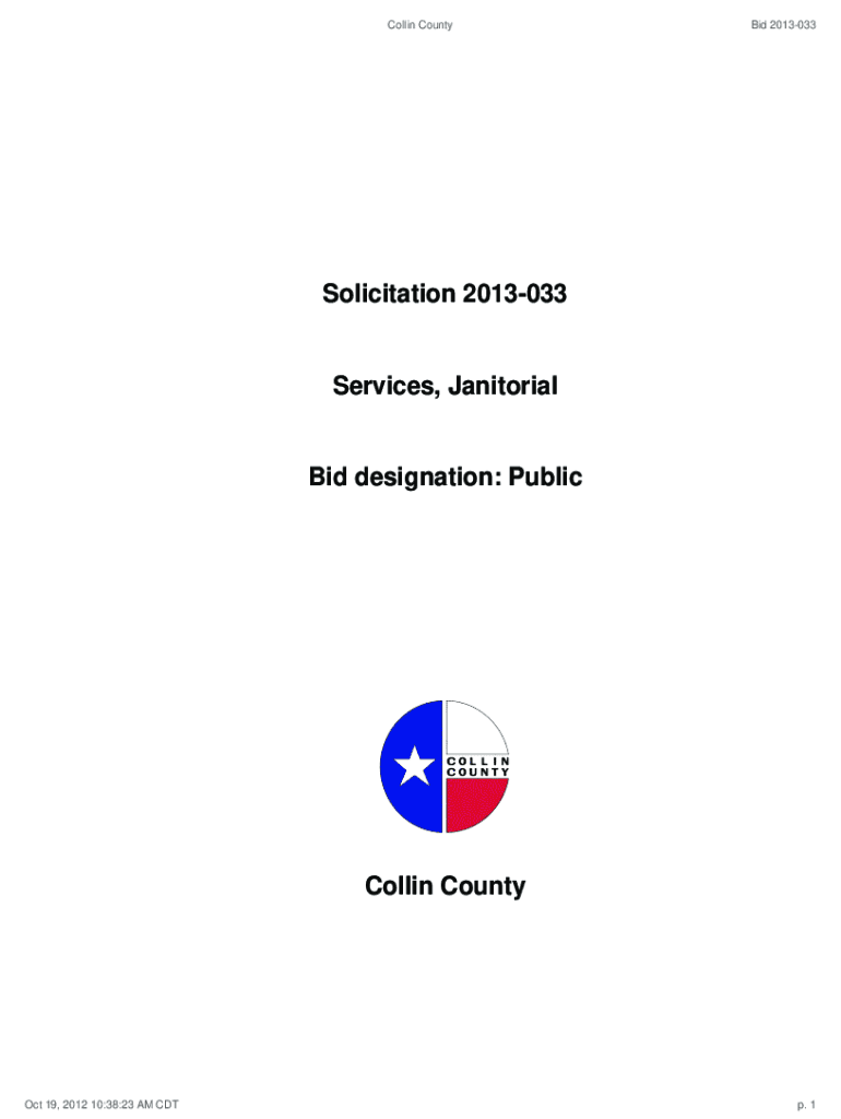 Collin Countywide 2013033Solicitation 2013033Services, Janitorial designation: Public Collin County Oct 19, 2012 10:38:23 AM CDT. 1Collin Countywide 2013033Bid 2013033 Services, Janitorial Bid Number2013033Bid
