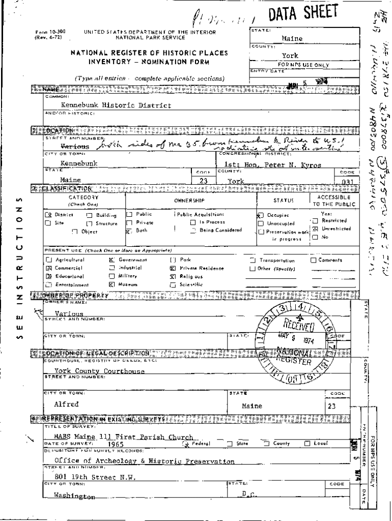 Form 10300 (Rev. 672)STATE:UNITED STATES DEPARTMENT OF THE INTERIOR NATIONAL PARK SERVICE Maine COUNTY:NATIONAL REGISTER OF HISTORIC PLACES INVENTORY NOMINATION FORM York FOR NPS USE ONLY ENTRY DATE(Type