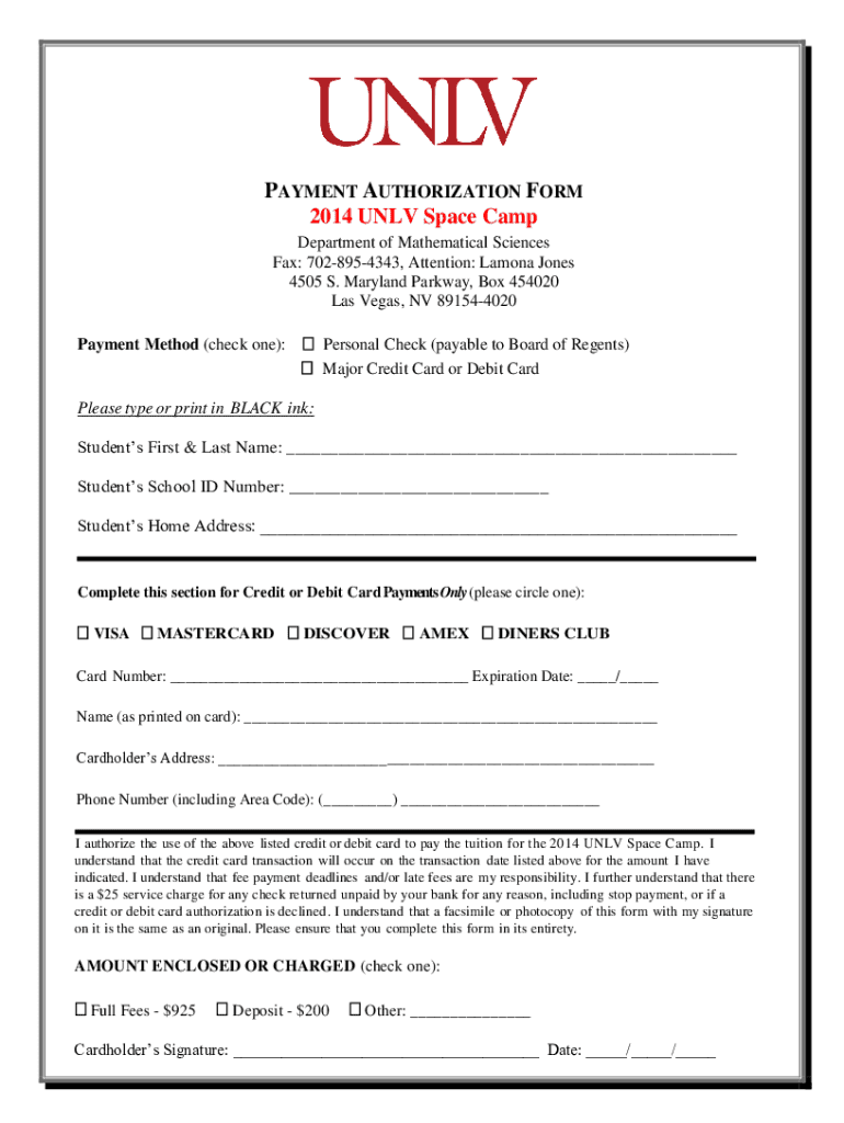 PAYMENT AUTHORIZATION FORM 2014 UNL Space Camp Department of Mathematical Sciences Fax: 7028954343, Attention: Lamont Jones 4505 S. Maryland Parkway, Box 454020 Las Vegas, NV 891544020 Payment Method