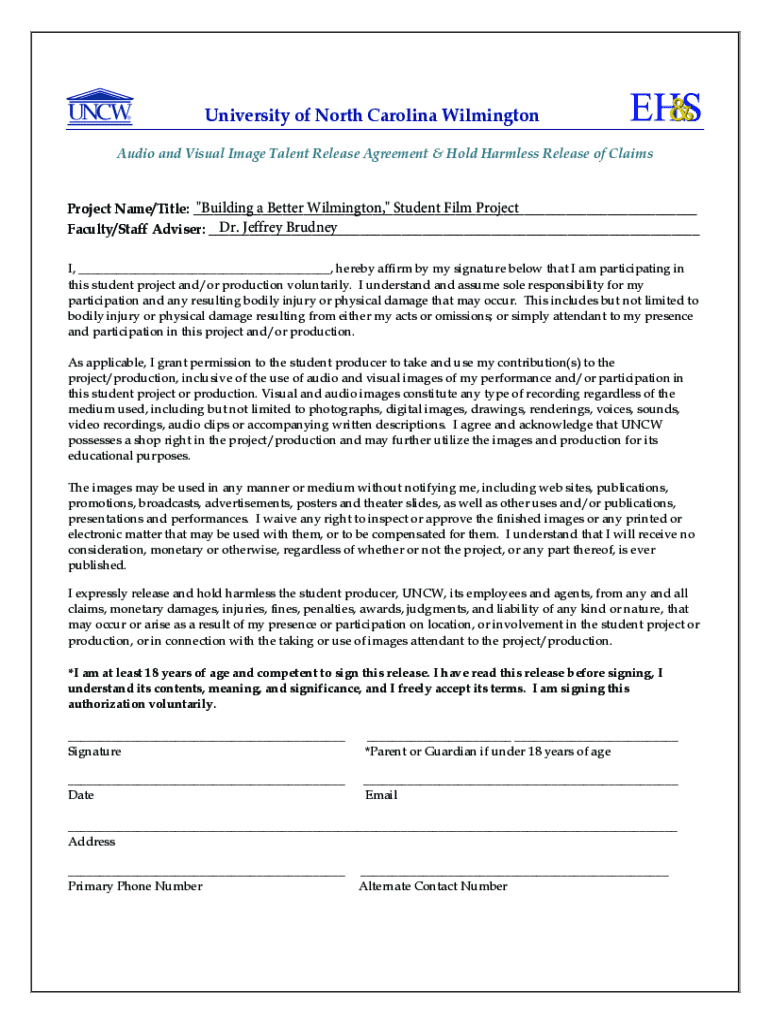 University of North Carolina Wilmington Audio and Visual Image Talent Release Agreement & Hold Harmless Release of Claims\” Building a Better Wilmington, \” Student Film Project Name/Title: ___