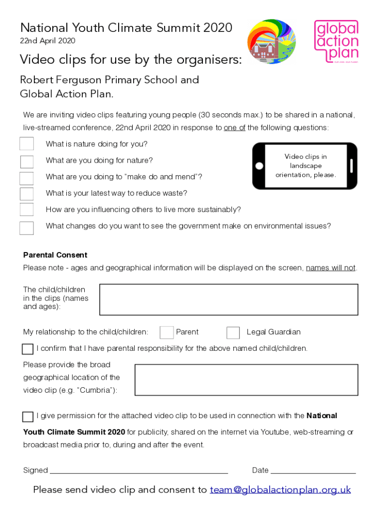 National Youth Climate Summit 2020 22nd April 2020Video clips for use by the organizers: Robert Ferguson Primary School and Global Action Plan. We are inviting video clips featuring young people (30