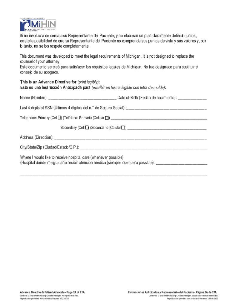 Advance Directive Instructions Anticipates Durable Power of Attorney for Healthcare Power Notarial para Santos Medicos (Patient Advocate Designation) (Designation Del Represent ante Del Patients)