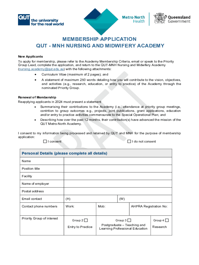 Get the free QUT-MNH Nursing and Midwifery Academy membership application form. Application form ...
