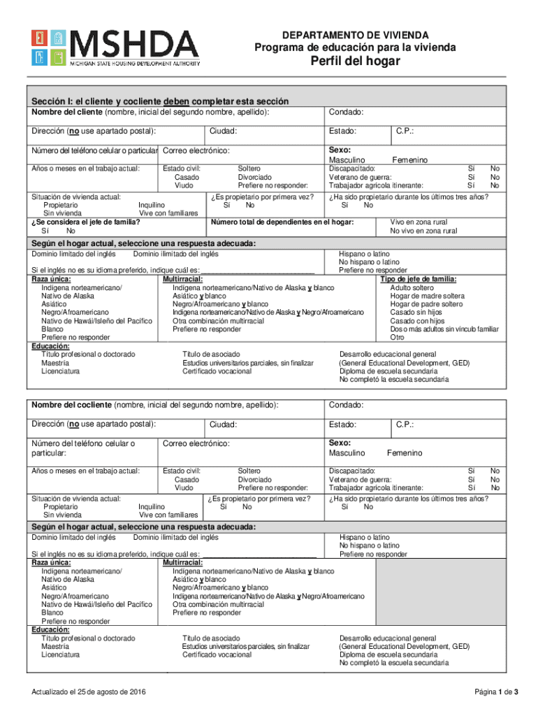 DEPARTMENT DE VIVIENDAPrograma de education para la viviendaPerfil Del Hagar Section I: El client y client Eben completer ESTA section Hombre Del client (hombre, initial Del Segundo hombre, Adelaide):Condado:Direction