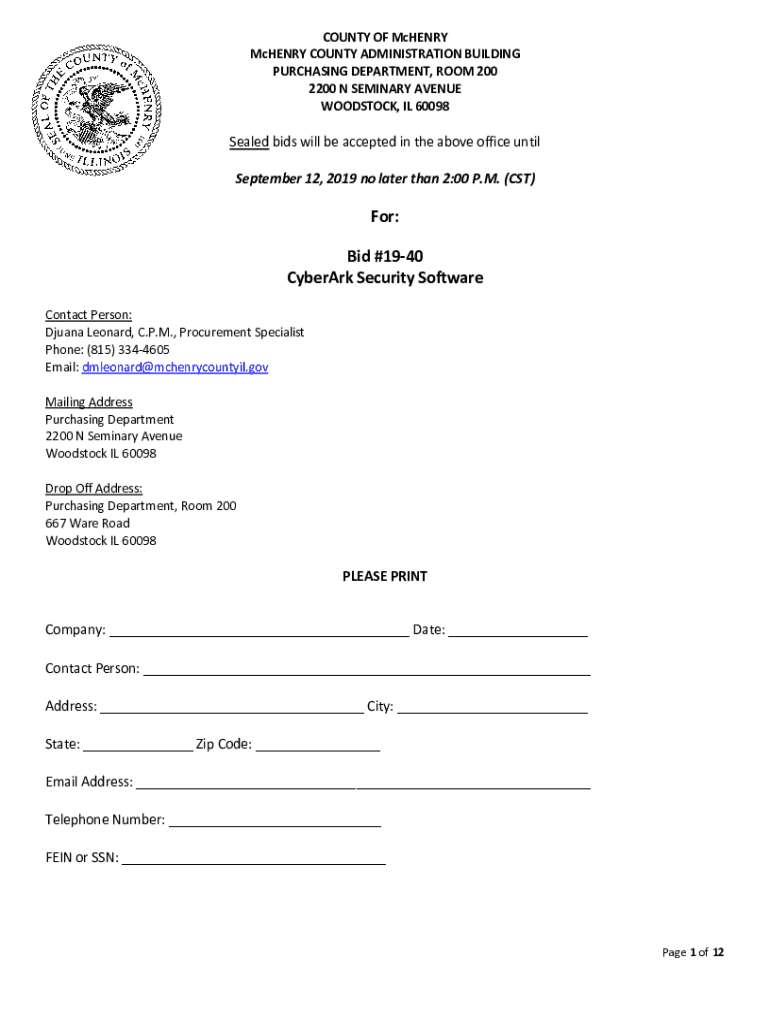 COUNTY OF McHenry County ADMINISTRATION BUILDING PURCHASING DEPARTMENT, ROOM 200 2200 N SEMINARY AVENUE WOODSTOCK, IL 60098Sealed bids will be accepted in the above office until September 12, 2019,