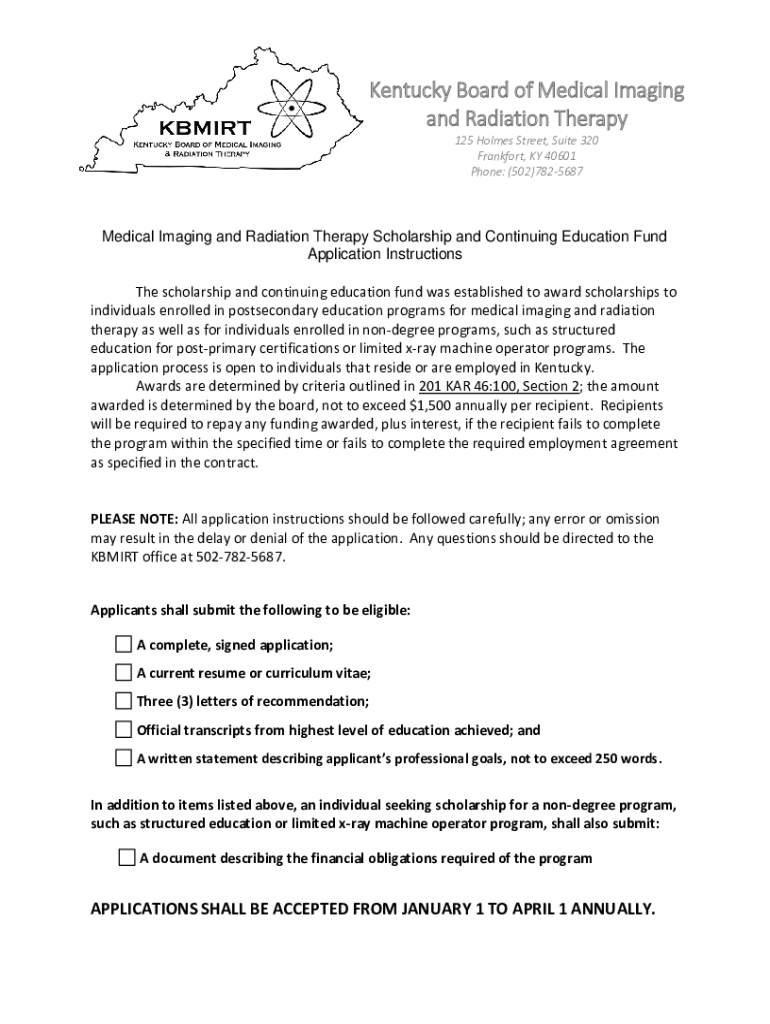 Kentucky Board of Medical Imaging and Radiation Therapy 125 Holmes Street, Suite 320 Frankfort, KY 40601 Phone: (502)7825687Medical Imaging and Radiation Therapy Scholarship and Continuing Education