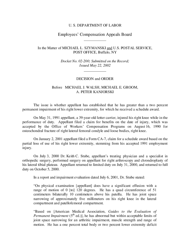 U. S. DEPARTMENT OF LABOREmployees Compensation Appeals Board ___ In the Matter of MICHAEL L. SZYMANSKI and U.S. POSTAL SERVICE, POST OFFICE, Buffalo, NY Docket No. 02200; Submitted on the Record;