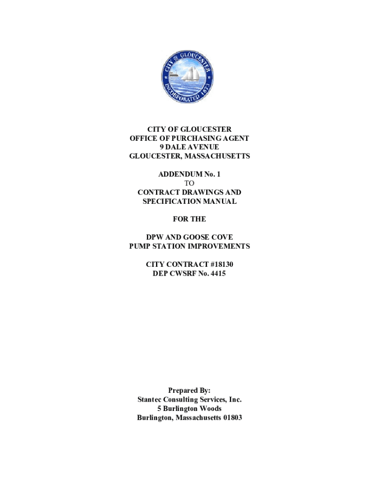 CITY OF GLOUCESTER OFFICE OF PURCHASING AGENT 9 DALE AVENUE GLOUCESTER, MASSACHUSETTS ADDENDUM No. 1 TO CONTRACT DRAWINGS AND SPECIFICATION MANUAL FOR THE DPW AND GOOSE COVE PUMP STATION IMPROVEMENTS