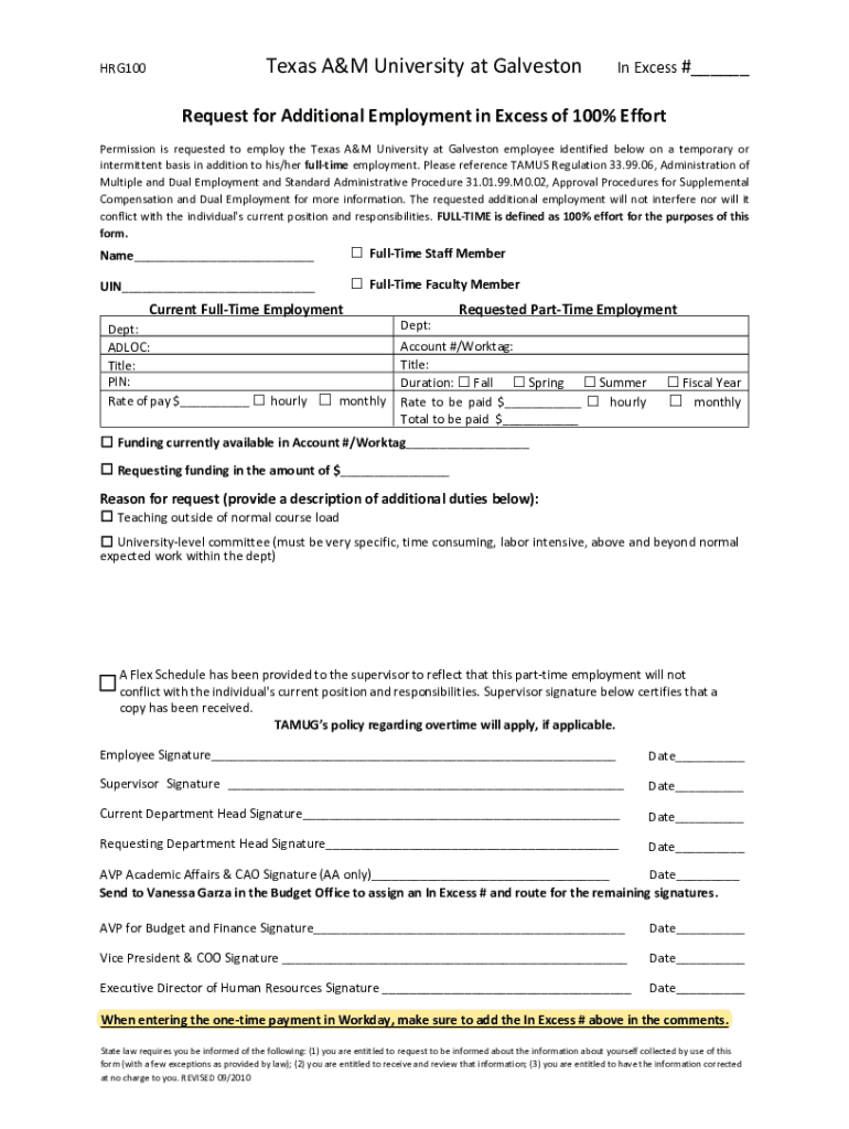 HRG100Texas A&M University at Galveston In Excess #___Request for Additional Employment in Excess of 100% Effort Permission is requested to employ the Texas A&M University at Galveston employee identified
