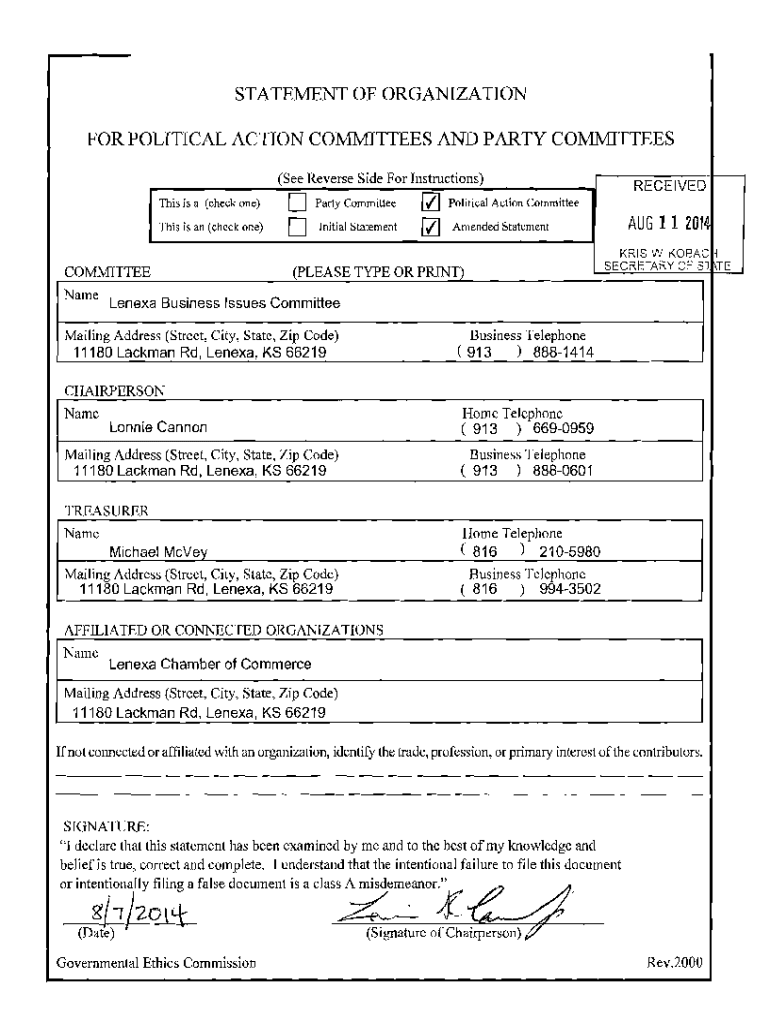 Get the free STATEMENT OF ORGANIZATION FOR POLITICAL ACTION COMMITTEES AND PARTY ... - ethics ks