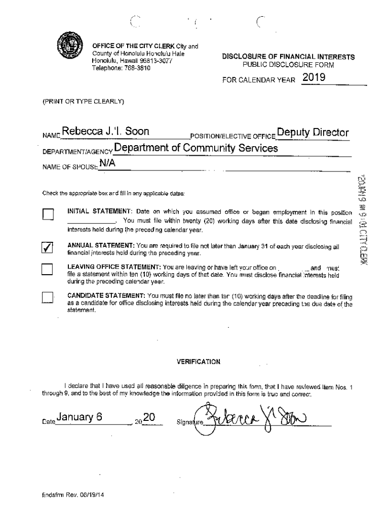C OFFICE OF THE CITY CLERK City and County of Honolulu Hale Honolulu, Hawaii 968133077 Telephone: 7683810DISCLOSURE OF FINANCIAL INTERESTS PUBLIC DISCLOSURE FORM FOR CALENDAR YEAR2019(PRINT OR TYPE