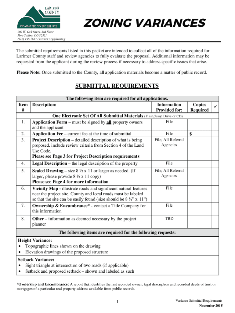 200 W. Oak Street, 3rd Floor Fort Collins, CO 80521 (970) 4987683 / larimer.org/planningZONING Variances submittal requirements listed in this packet are intended to collect all the information required