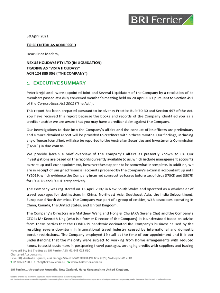 30 April 2021 TO CREDITOR AS ADDRESSED Dear Sir or Madam, NEXUS HOLIDAYS PTY LTD (IN LIQUIDATION) TRADING AS VISTA HOLIDAYS ACN 124 885 356 (THE COMPANY)1. EXECUTIVE SUMMARY Peter French and I were