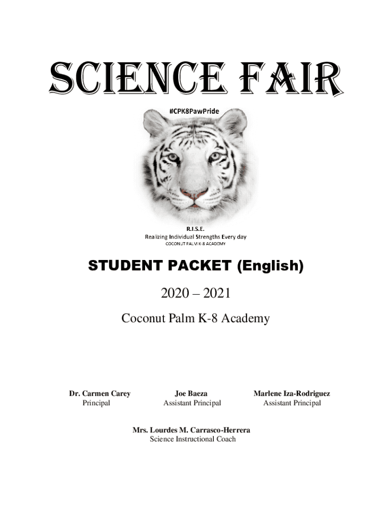 Science FairSTUDENT PACKET (English) 2020 2021 Coconut Palm K8 Academy Dr. Carmen Carey Principal Joe Baez Assistant Principal Mrs. Lourdes M. Carrasco Herrera Science Instructional Coach Marlene