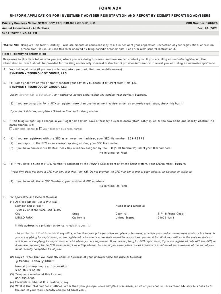 FORM ADV UNIFORM APPLICATION FOR INVESTMENT ADVISER REGISTRATION AND REPORT BY EXEMPT REPORTING ADVISERS Primary Business Name: SYMPHONY TECHNOLOGY GROUP, LLC CRD Number: 160676Annual Amendment All