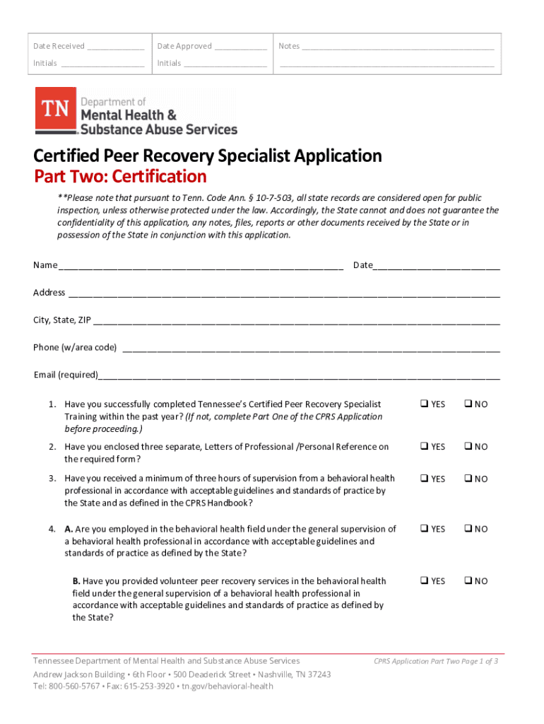 Date Received ___Date Approved ___Notes ___Initials ___Initials ______Certified Peer Recovery Specialist Application Part Two: Certification **Please note that pursuant to Tenn. Code Ann. 107503,