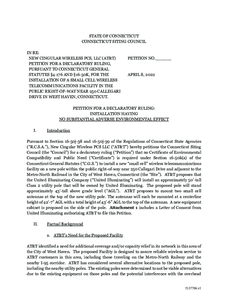 STATE OF CONNECTICUT SITING COUNCIL IN RE: NEW SINGULAR WIRELESS PCS, LLC (AT&T) PETITION FOR A DECLARATORY RULING, PURSUANT TO CONNECTICUT GENERAL STATUTES 4176 AND 1650K, FOR THE INSTALLATION OF