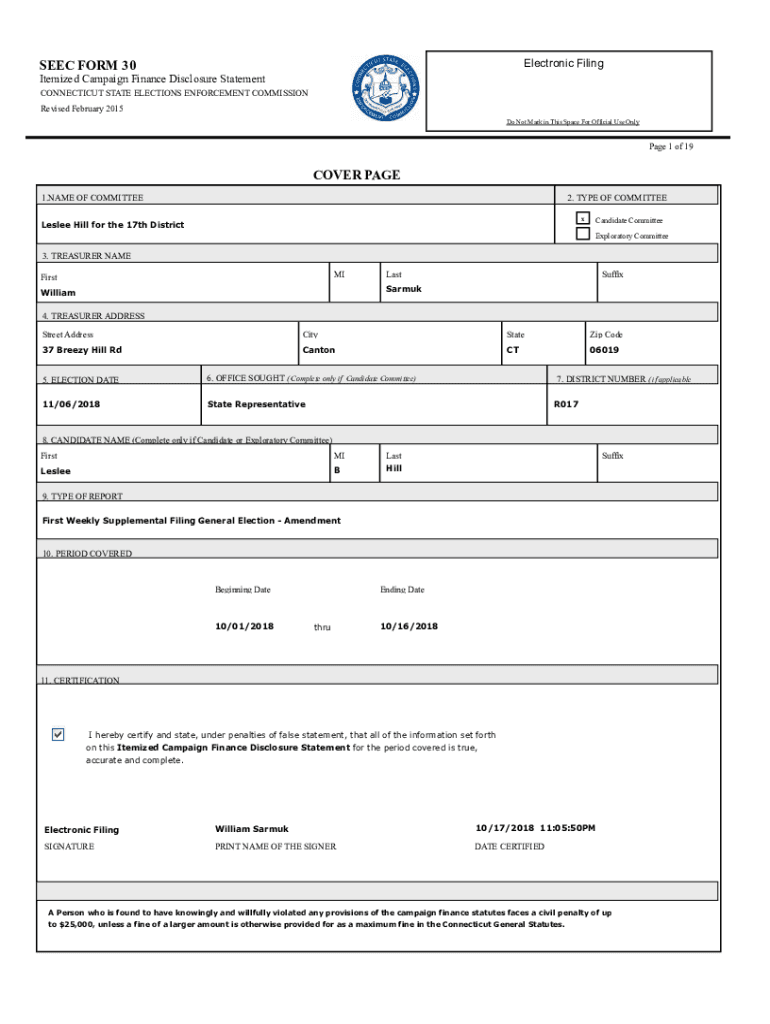 Electronic Filings EEC FORM 30Itemized Campaign Finance Disclosure Statement CONNECTICUT STATE ELECTIONS ENFORCEMENT COMMISSION Revised February 2015 Do Not Mark in This Space For Official Use Only