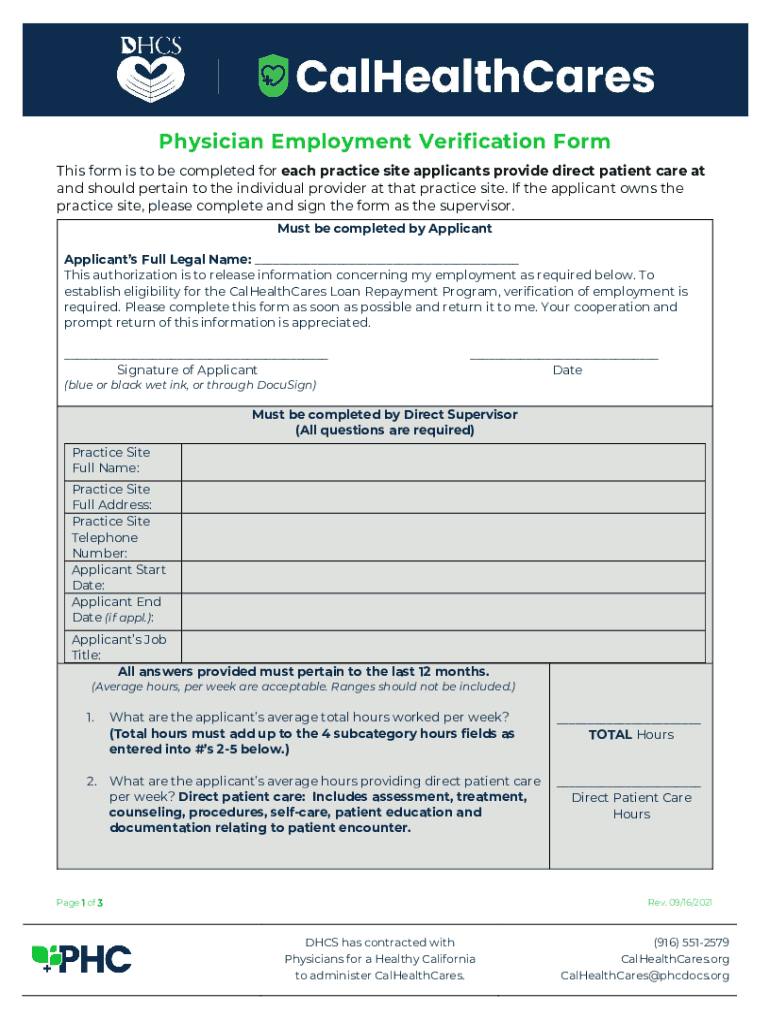 Physician Employment Verification Form This form is to be completed for each practice site applicants provide direct patient care at and should pertain to the individual provider at that practice