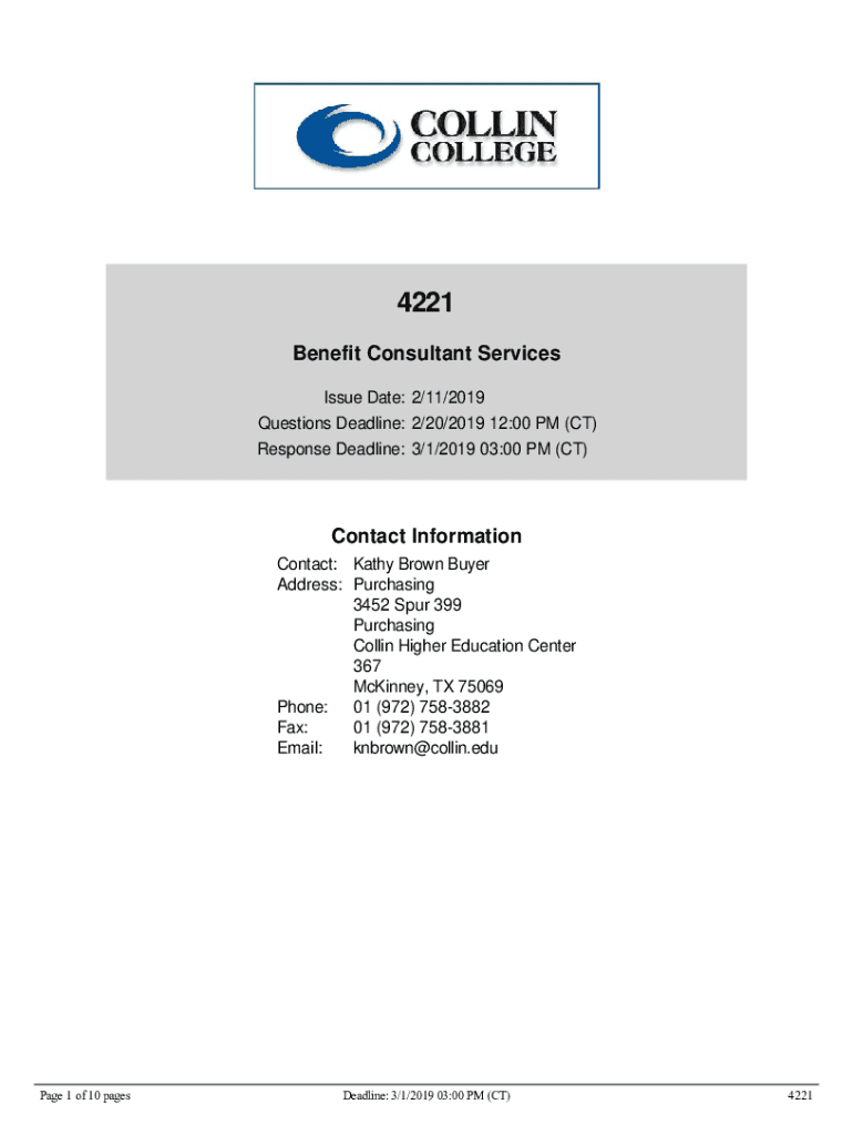4221 Benefit Consultant Services Issue Date: 2/11/2019 Questions Deadline: 2/20/2019 12:00 PM (CT) Response Deadline: 3/1/2019 03:00 PM (CT)Contact Information Contact: Kathy Brown Buyer Address: