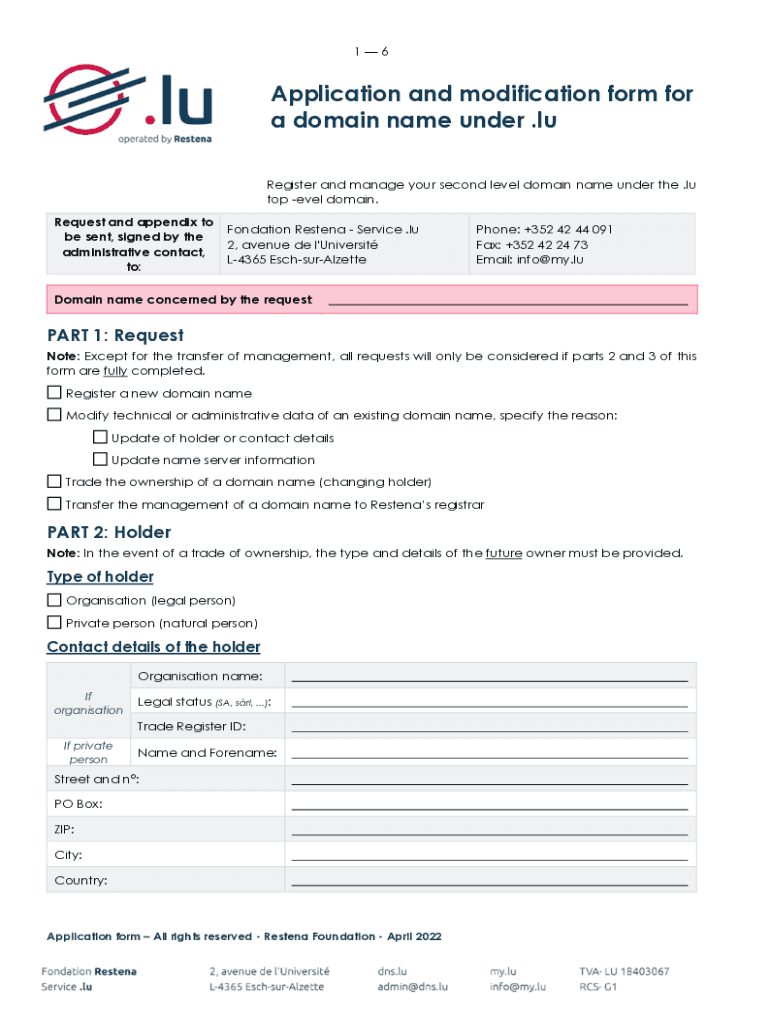 16Application and modification form for a domain name under. LU Register and manage your second level domain name under the. LU top even domain. Request and appendix to be sent, signed by the administrative