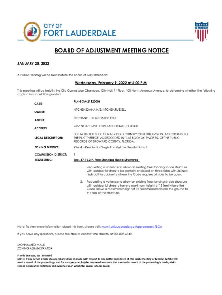 BOARD OF ADJUSTMENT MEETING NOTICE JANUARY 20, 2022, A Public Hearing will be held before the Board of Adjustment on:Wednesday, February 9, 2022, at 6:00 P. M This meeting will be held in the City