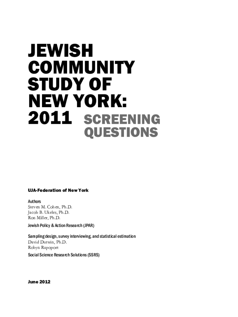 JEWISH COMMUNITY STUDY OF NEW YORK: 2011 SCREENING QUESTIONSUJAFederation of New York Authors Steven M. Cohen, Ph.D. Jacob B. Useless, Ph.D. Ron Miller, Ph.D. Jewish Policy & Action Research (PAR)