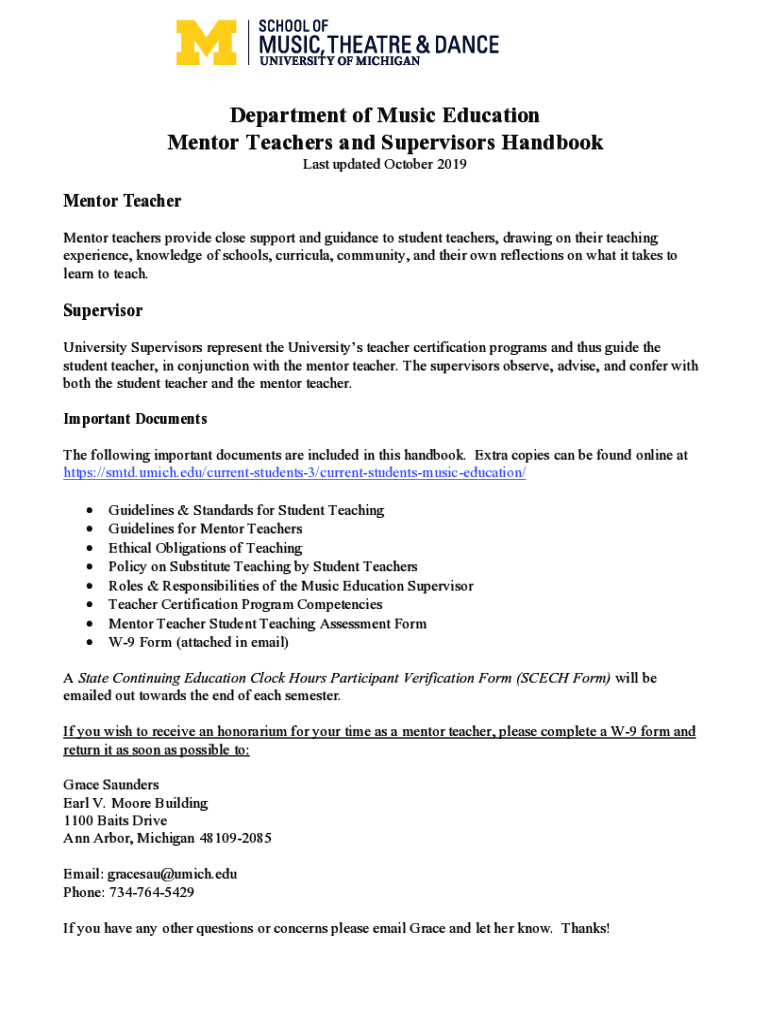 Department of Music Education Mentor Teachers and Supervisors Handbook Last updated October 2019Mentor Teacher Mentor teachers provide close support and guidance to student teachers, drawing on their