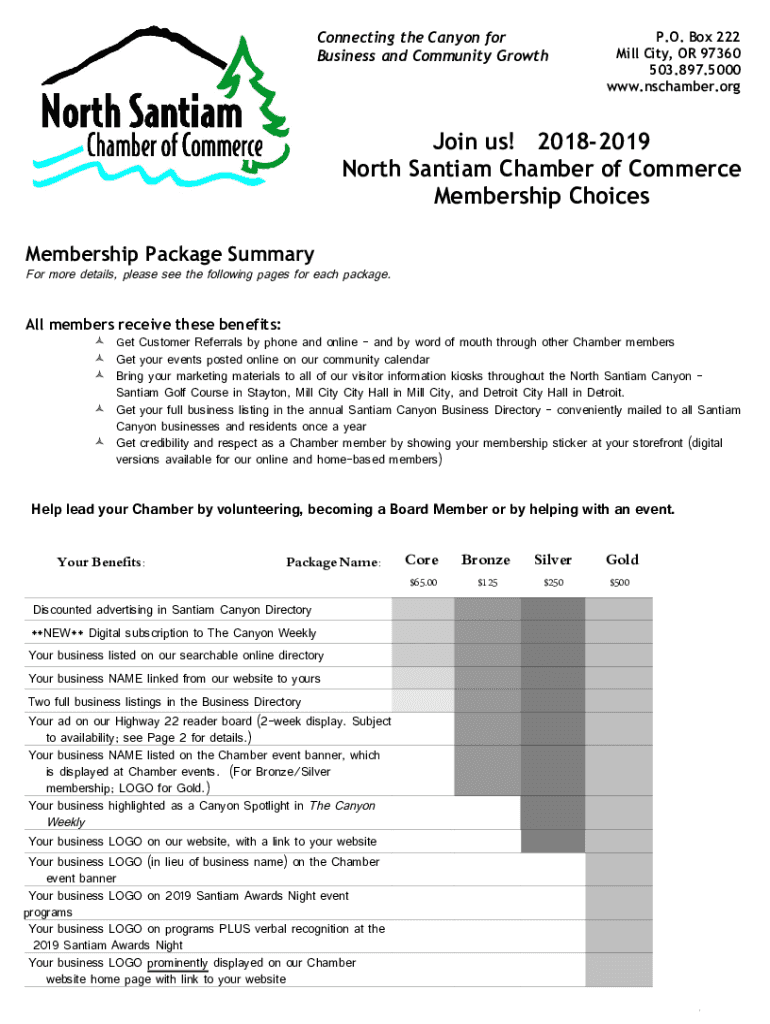 Connecting the Canyon for Business and Community Growth. O. Box 222 Mill City, OR 97360 503.897.5000 www.nschamber.orgJoin us! 20182019 North Santa Chamber of Commerce Membership Choices Membership