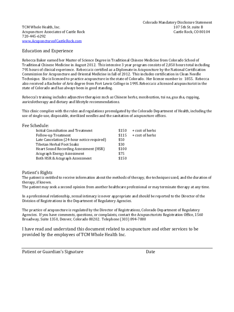 TCM Whole Health, Inc. Acupuncture Associates of Castle Rock7204456292www. AcupunctureofCastleRock.com Colorado Mandatory Disclosure Statement107 5th St. suite Castle Rock, CO 80104Education and ExperienceRebecca