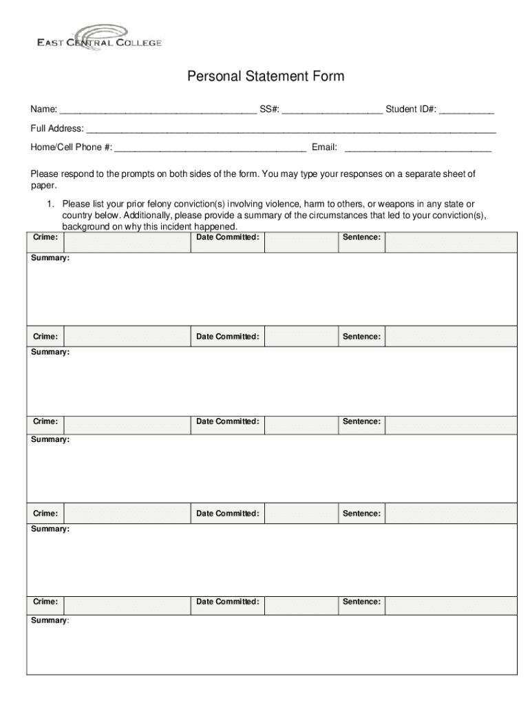 What information must be reported on wwweastcentraleduadmissionswp-contentpersonal statement form?