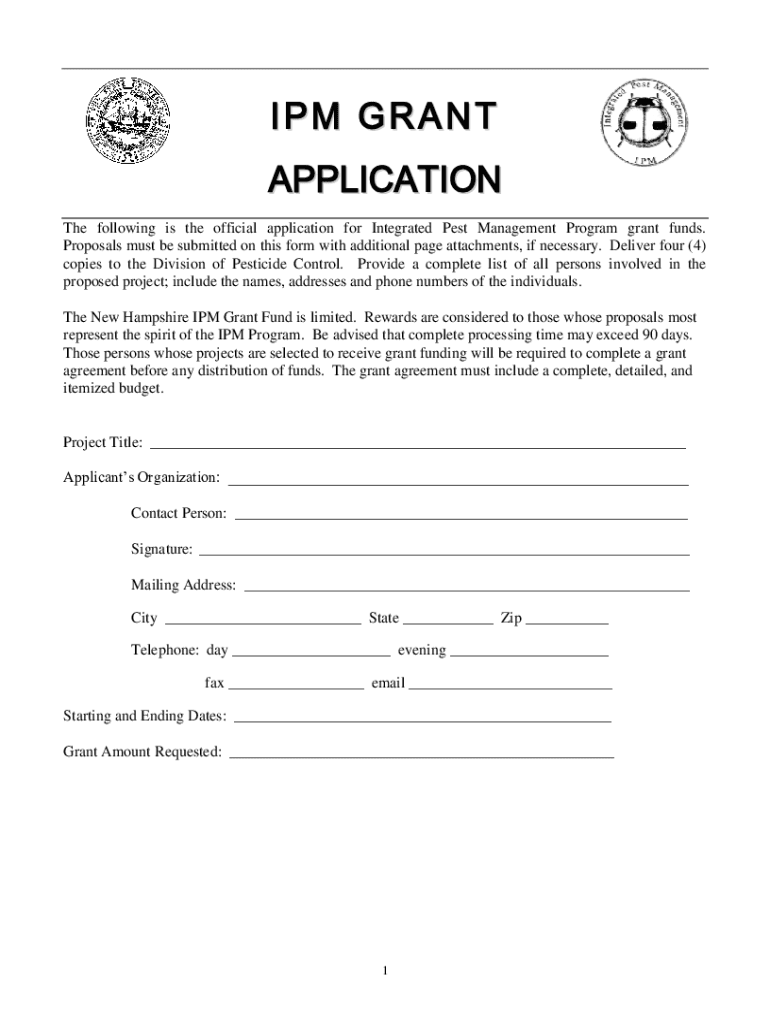 IPM GRANT APPLICATION The following is the official application for Integrated Pest Management Program grant funds. Proposals must be submitted on this form with additional page attachments, if necessary.